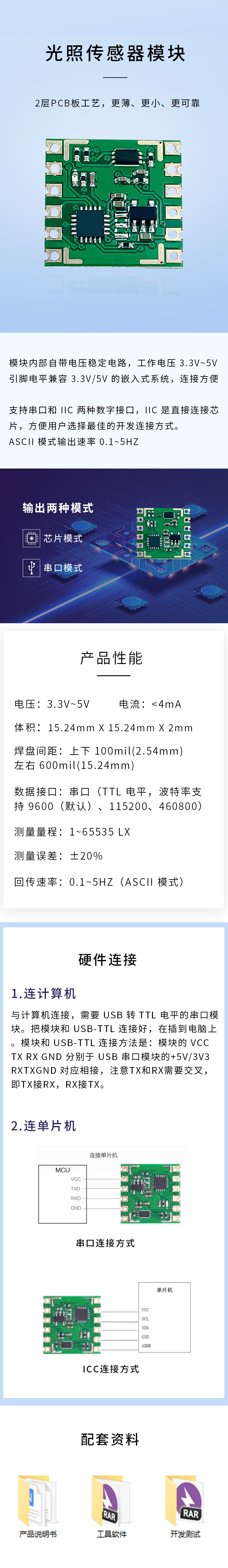 ASCII 模式输出速率 0.1~5Hz. 2 层 PCB 板工艺,更薄、更小、更可靠。两种模式:串口模式,芯片模式.