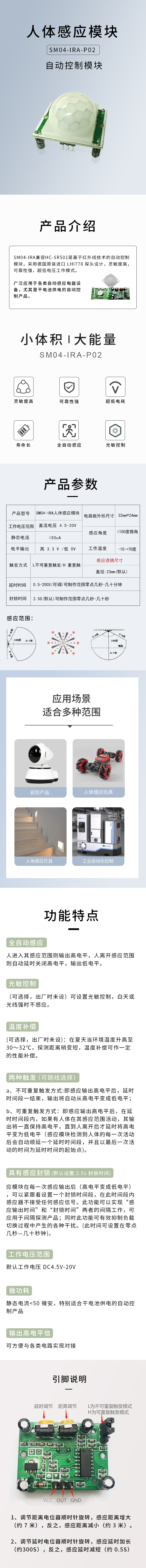 SM04-IRA兼容HC-SR501是基于红外线技术的自动控制模块,采用德国原装进口 LHI778 探头设计,灵敏度高,可靠性强,超低电压工作模式,广泛应用于各类自动感应电器设备,尤其是干电池供电的自动控制产品。