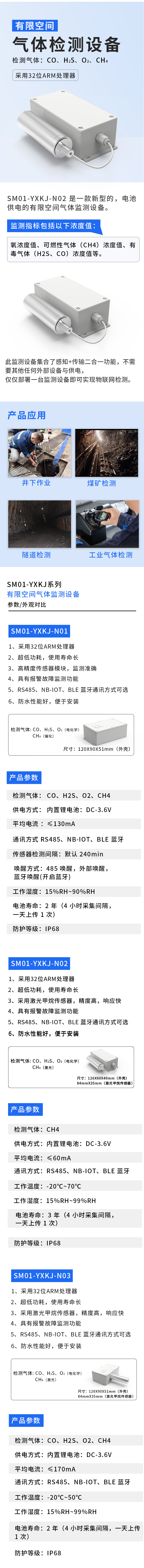 SM01-YXKJ-N02是一款新型的,电池供电的有限空间气体监测设备。主要通过激光甲烷传感器监测CH4浓度值。此监测设备集合了感知+传输二合一功能,不需要其他任何外部设备与供电,仅仅部署一台监测设备即可实现物联网检测。